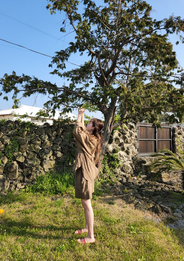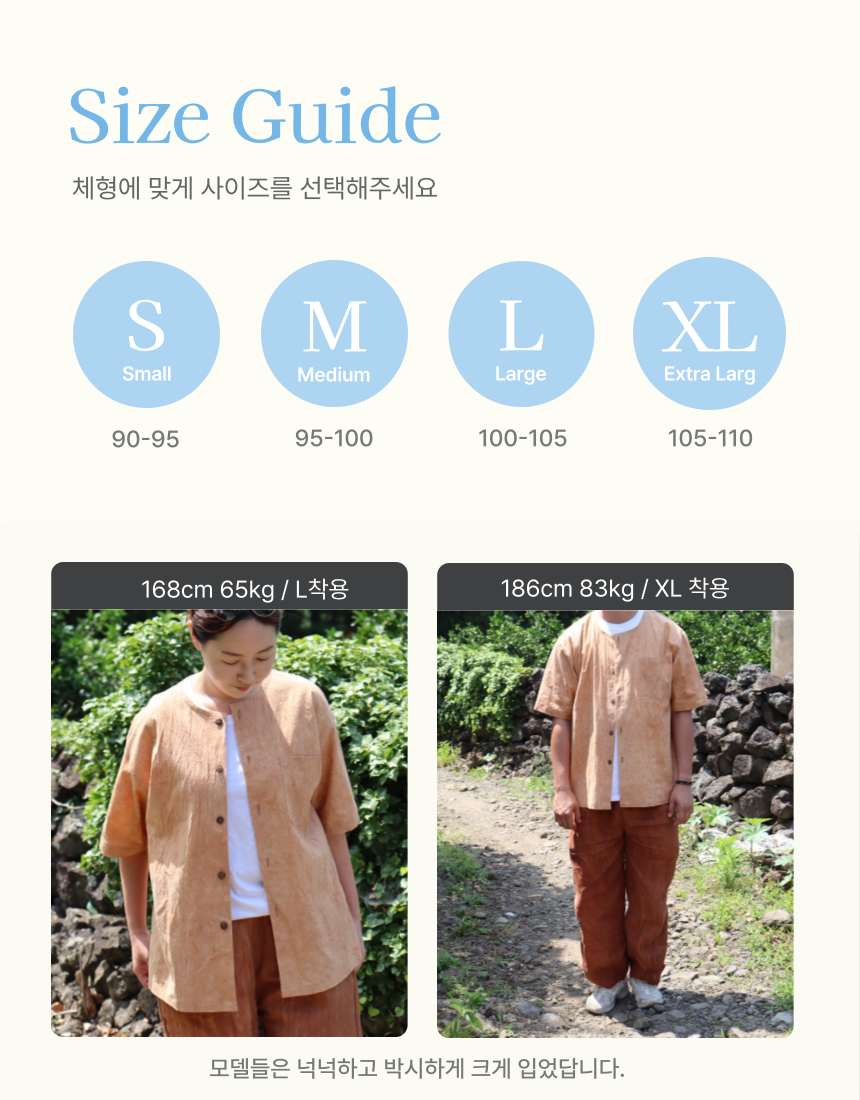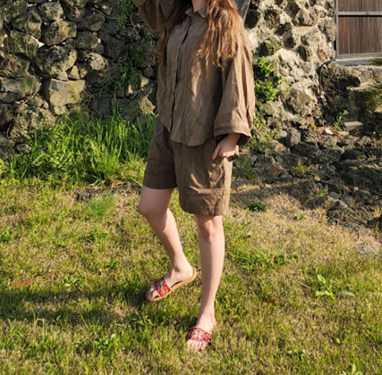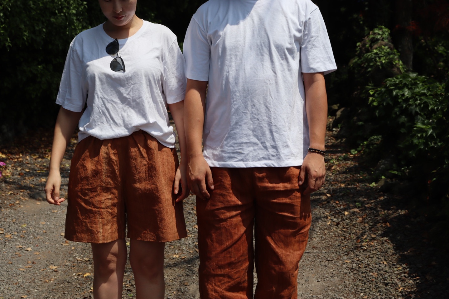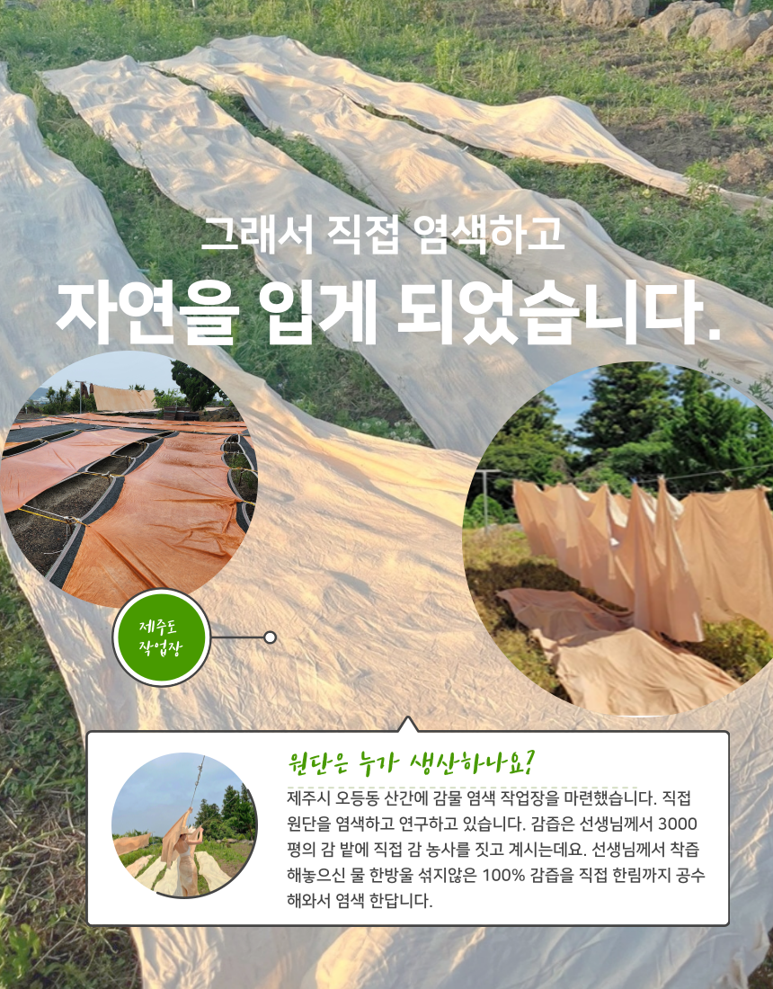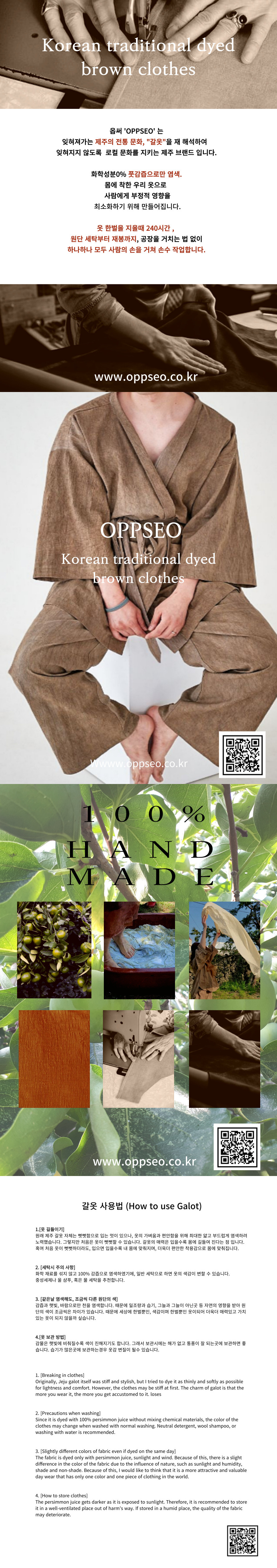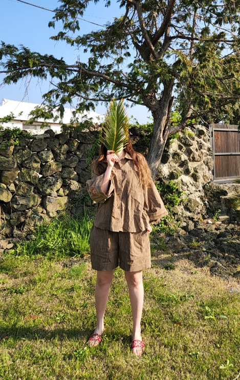 제주의 자연과 고즈넉함을 자연염색으로 담아낸 라운지웨어 숏 바지 입니다. 햇빛과 바람, 감즙으로만 염색하여 친환경적이며 통기성과 향균성, 방수성과 발수성에 탁월합니다. The advantage of brown clothes is that the fabric is hard, so you don't need to do fine work, such as starching or ironing after washing. It is cool in summer due to its good ventilation and low thermal conductivity. In addition, it is resistant to moisture, so even if you sweat, the cloth does not stick to your body. Since persimmon juice acts as a preservative, the fabric does not damage the sweat. After dyeing, it becomes twice as durable. |