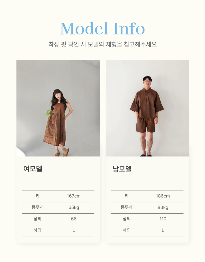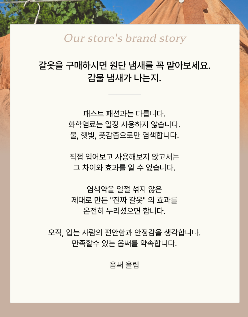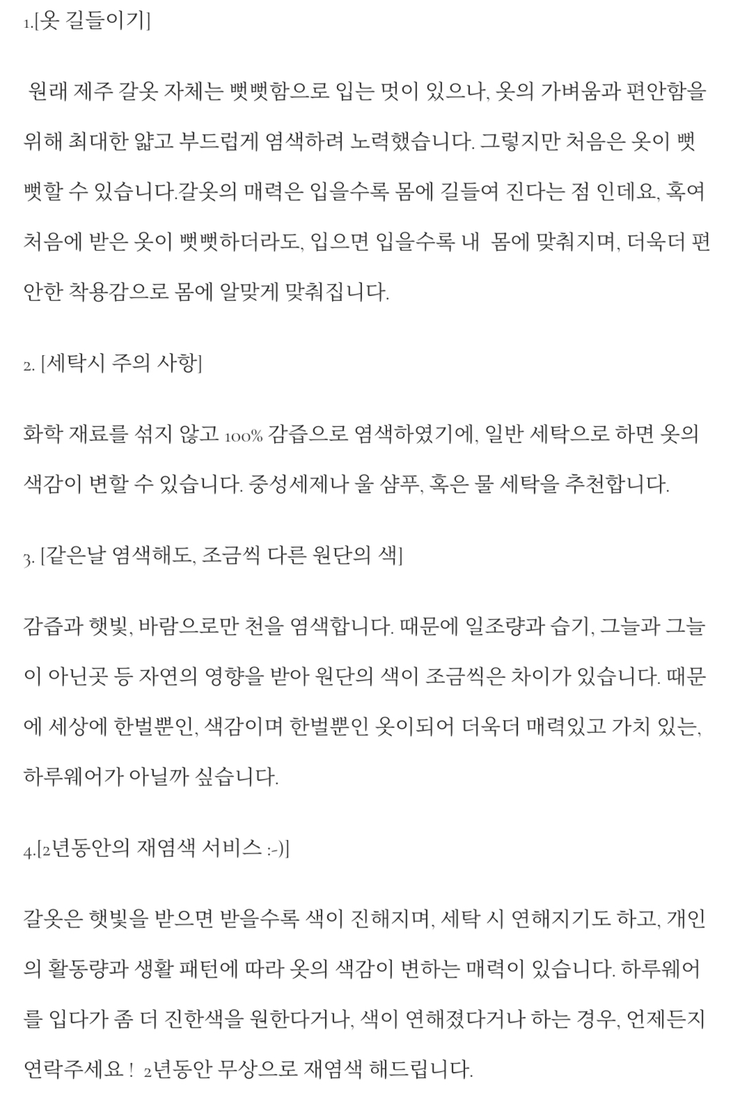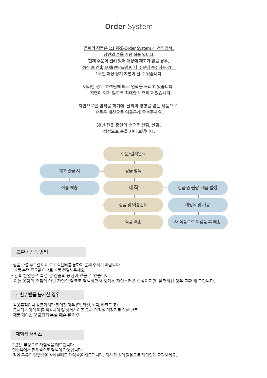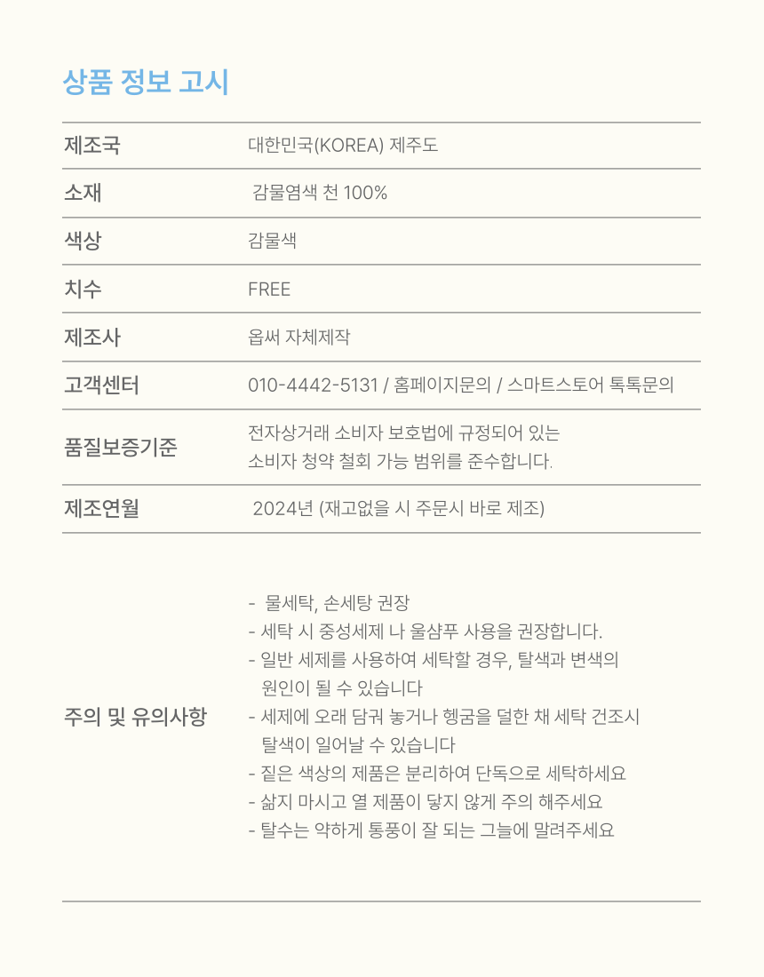 제주의 자연과 고즈넉함을 자연염색으로 담아낸 라운지웨어 숏 바지 입니다. 햇빛과 바람, 감즙으로만 염색하여 친환경적이며 통기성과 향균성, 방수성과 발수성에 탁월합니다. The advantage of brown clothes is that the fabric is hard, so you don't need to do fine work, such as starching or ironing after washing. It is cool in summer due to its good ventilation and low thermal conductivity. In addition, it is resistant to moisture, so even if you sweat, the cloth does not stick to your body. Since persimmon juice acts as a preservative, the fabric does not damage the sweat. After dyeing, it becomes twice as durable. |