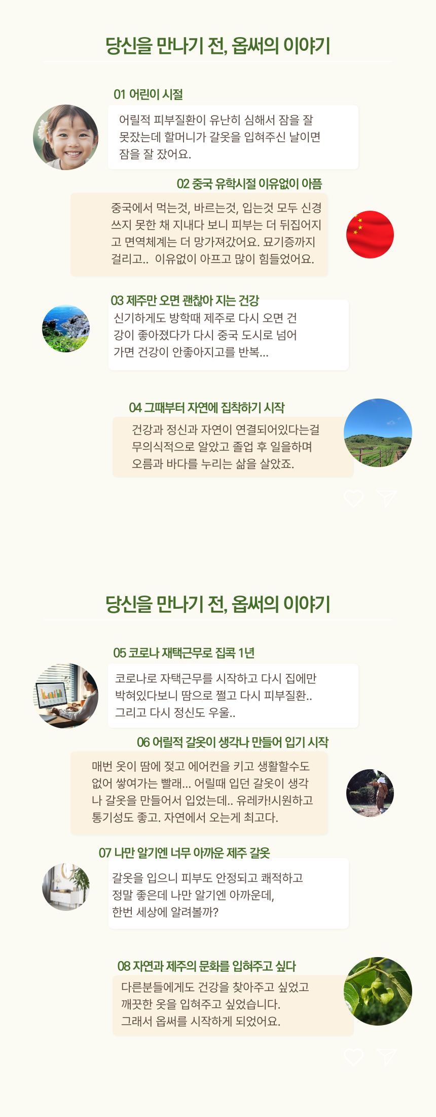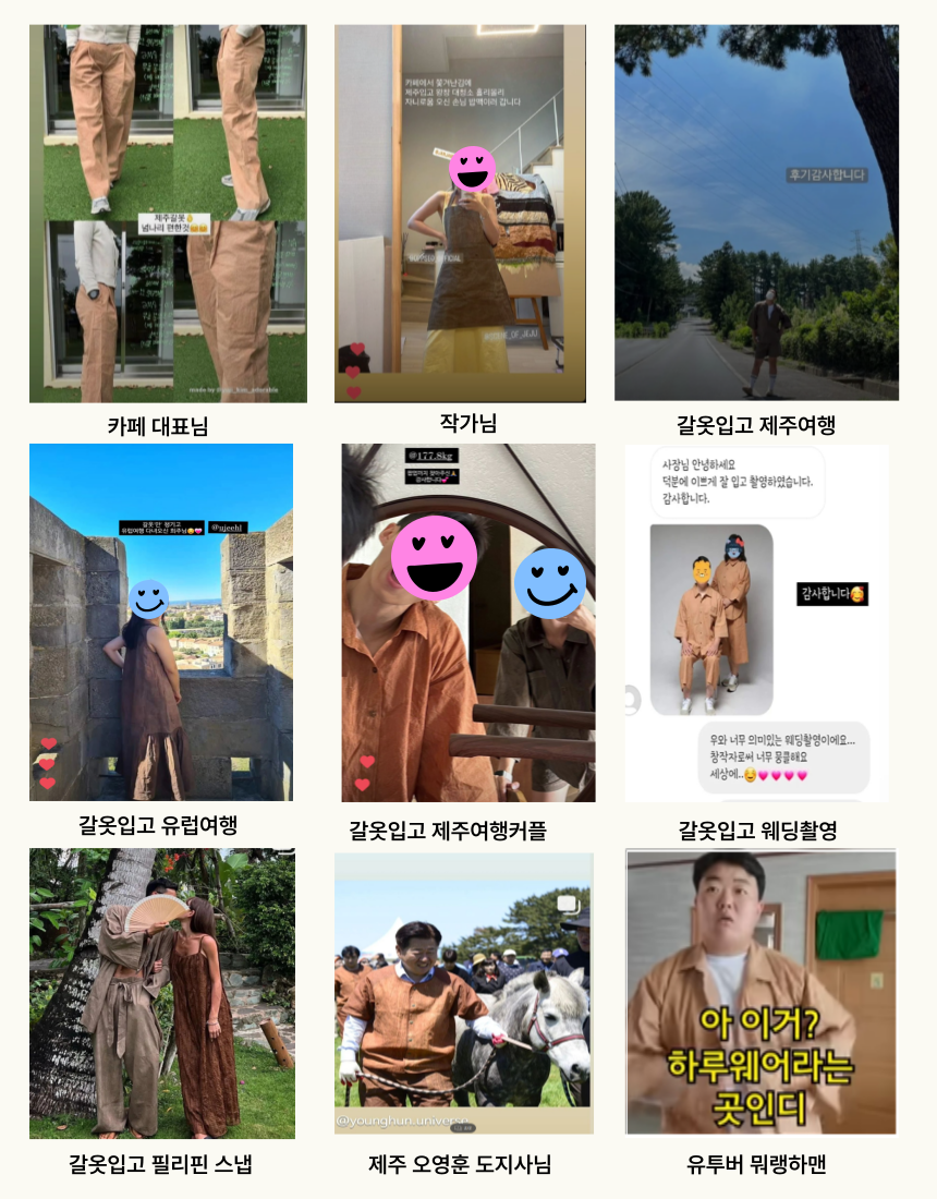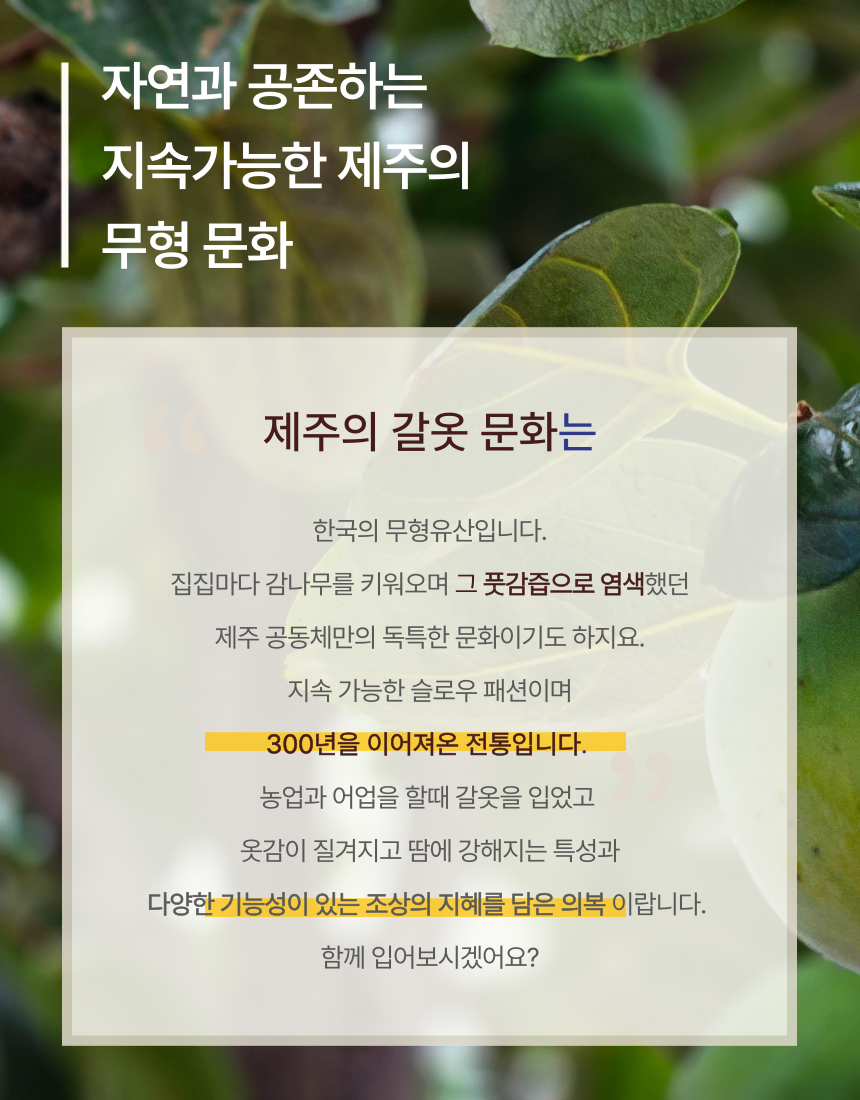 갈옷은 천연 소재로 제작되어 피부에 부드럽고 편안한 착용감을 선사합니다. 갈옷을 입으면 고요한 제주 자연 속에서 마음을 안정시키고 옛날 제주 사람들의 삶과 문화를 생각하게 됩니다. 그리고 갈옷의 색감과 패턴은 독특하고 아름답기 때문에 더욱 감성적인 느낌을 주며, 입는 사람의 개성과 분위기를 더욱 돋보이게 해줍니다.